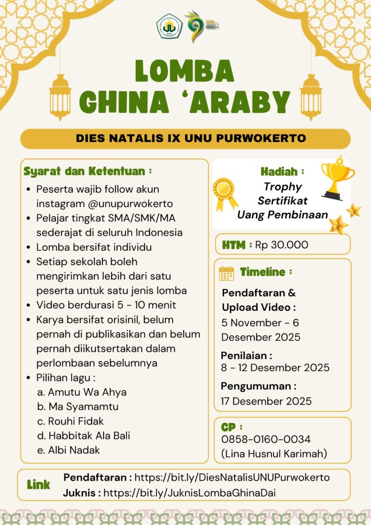 Purwokerto (12/11). Universitas Nahdlatul Ulama (UNU) Purwokerto kembali menghadirkan semarak Dies Natalis IX dengan menyelenggarakan Lomba Ghina ‘Araby 2025, sebuah ajang bergengsi yang ditujukan bagi pelajar tingkat SMA/SMK/MA sederajat di seluruh Indonesia. Lomba ini menjadi wadah ekspresi seni dan cinta terhadap bahasa Arab, yang dikemas dalam bentuk kompetisi menyanyi lagu-lagu Arab Islami.